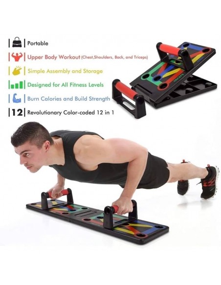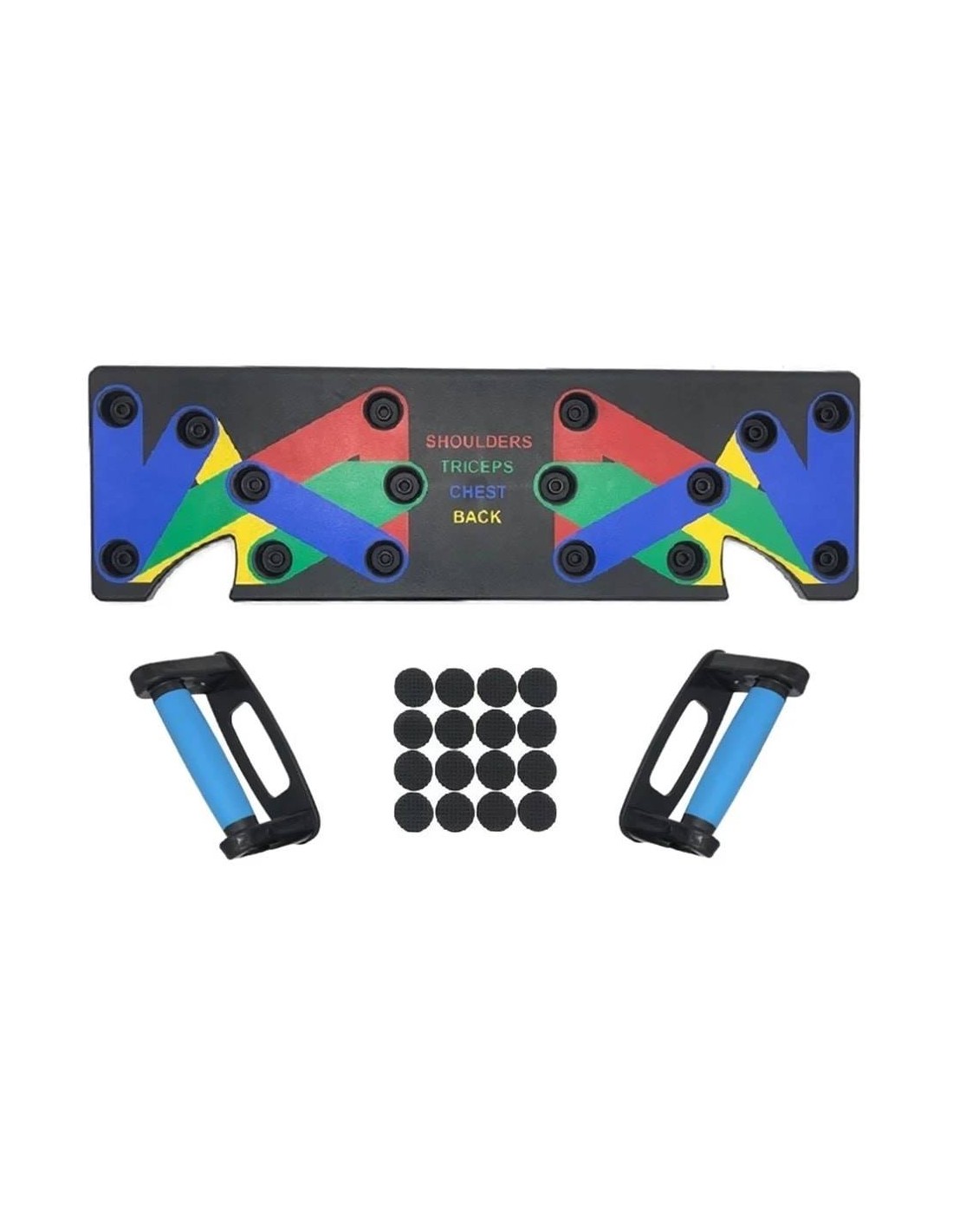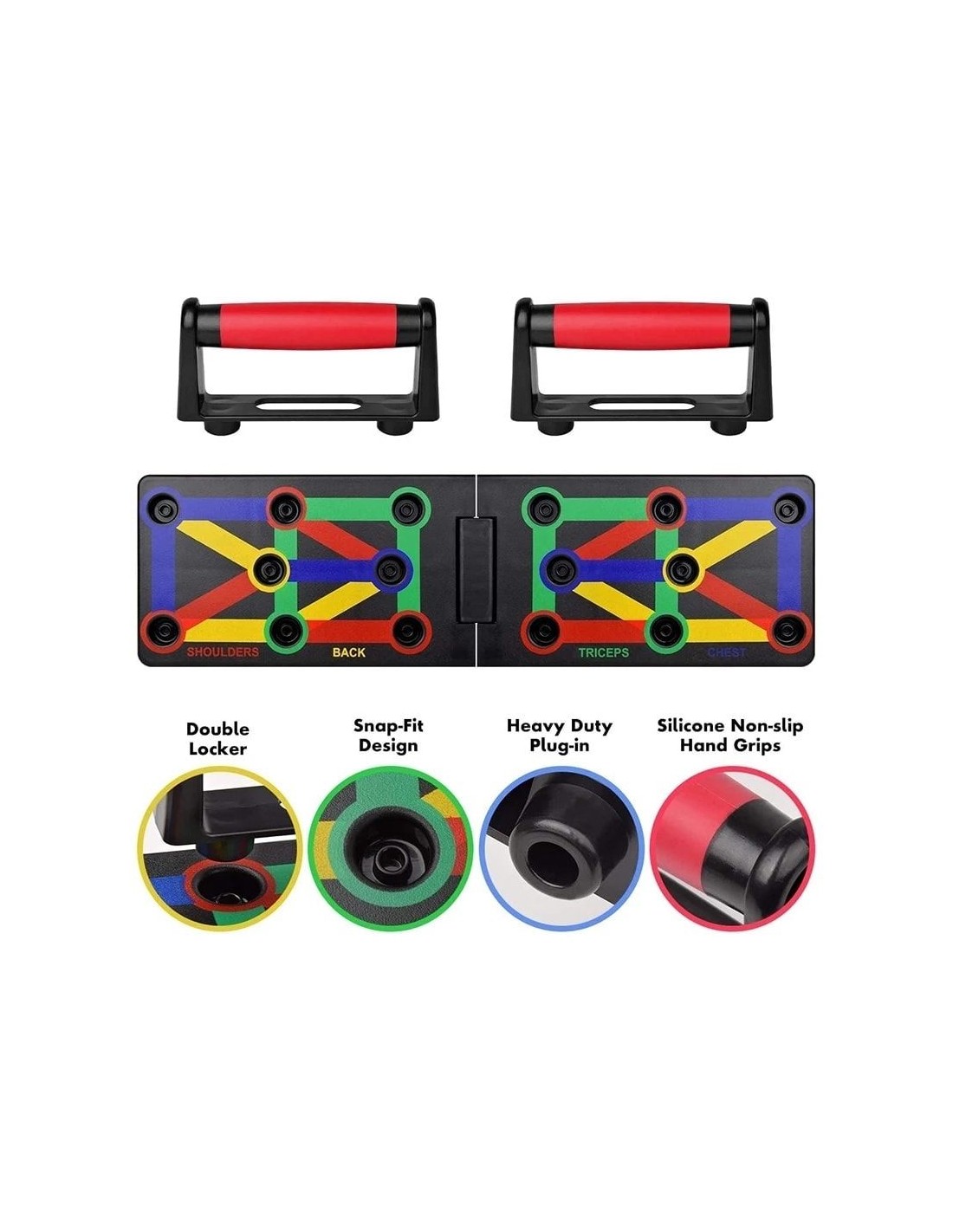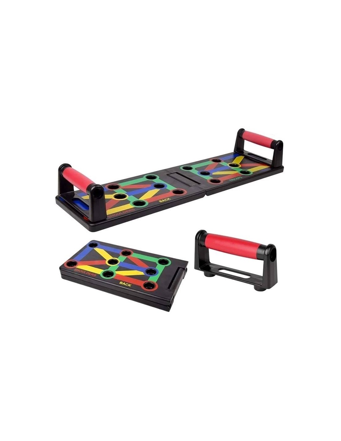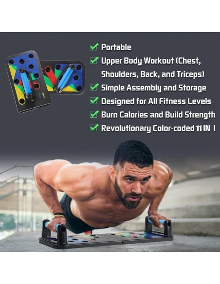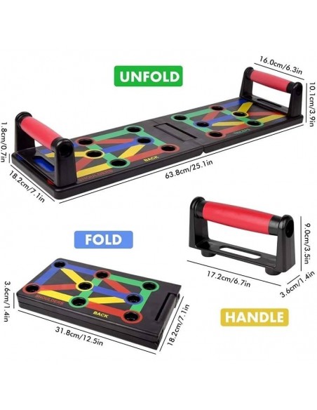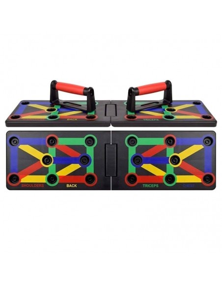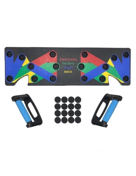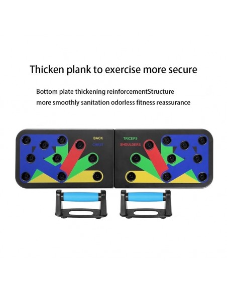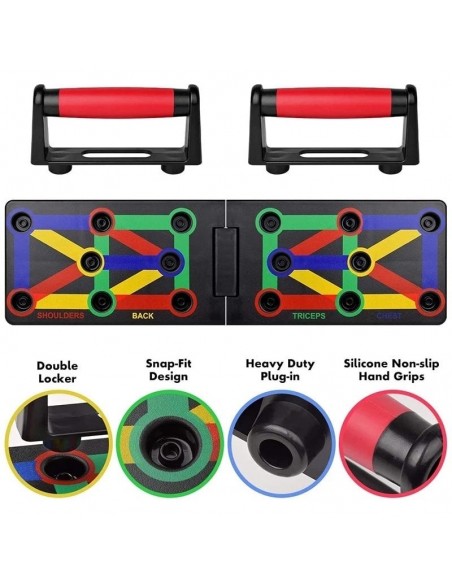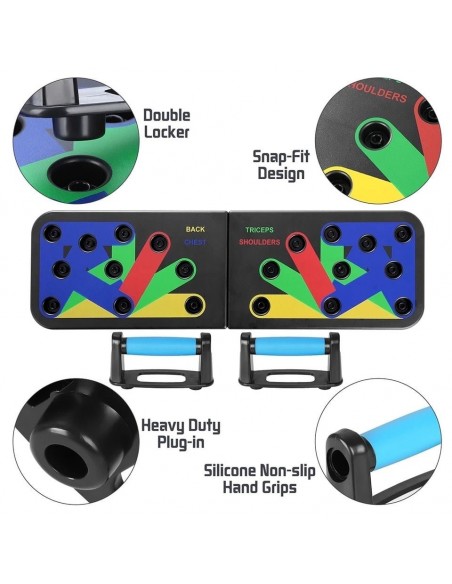 - Πολυλειτουργικό: Διαφορετική χρωματική κωδικοποίηση push up board στοχεύει σε συγκεκριμένους μυς που έχουν εργαστεί (Μπλε-στήθος, κόκκινο-ώμους, Κίτρινο-πλάτη και Πράσινο-τρικέφαλος)