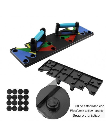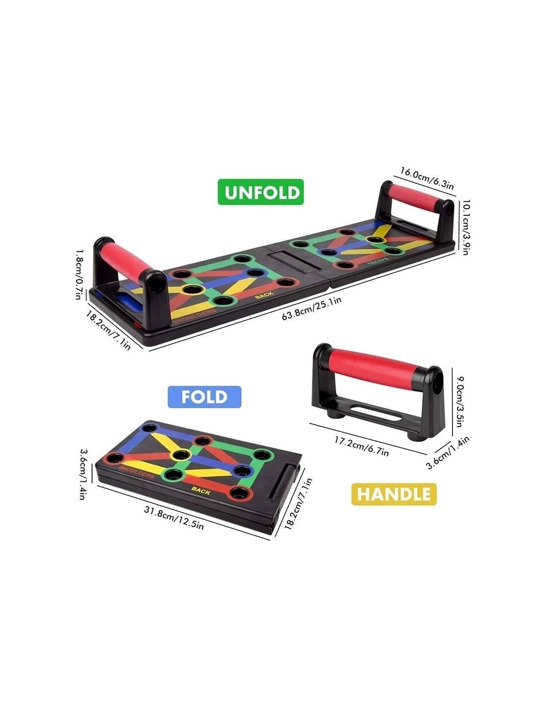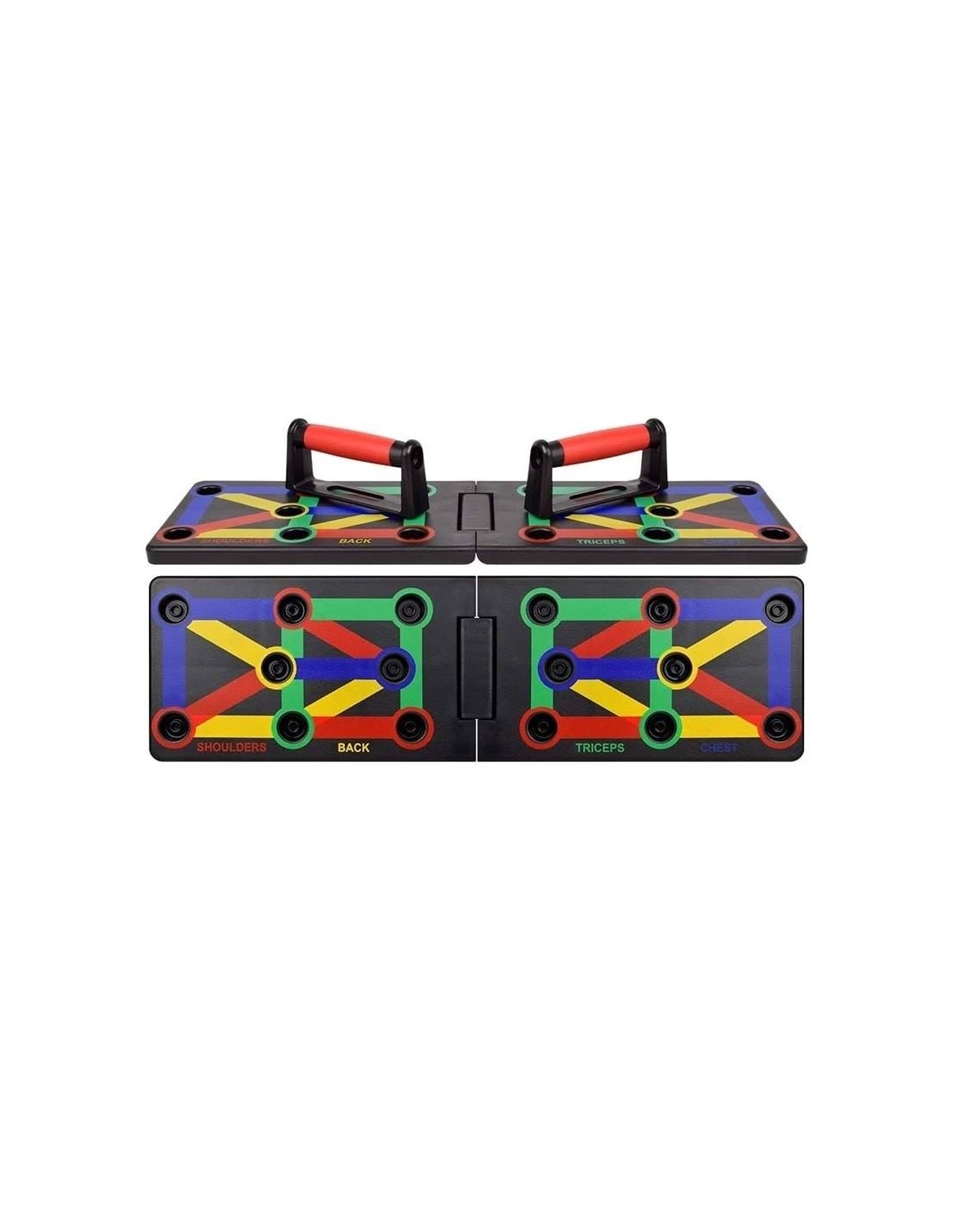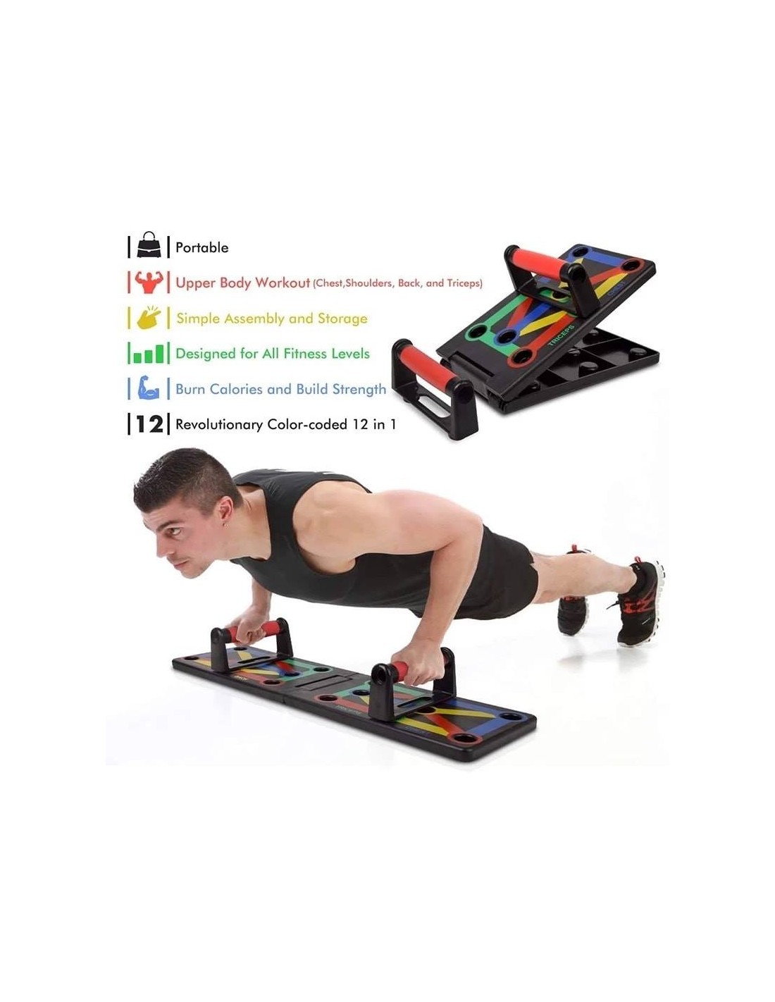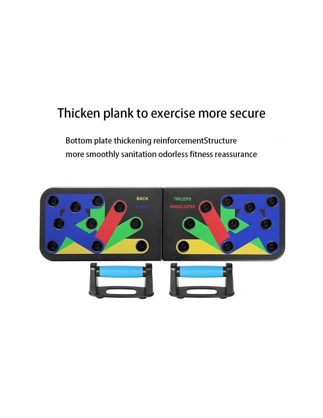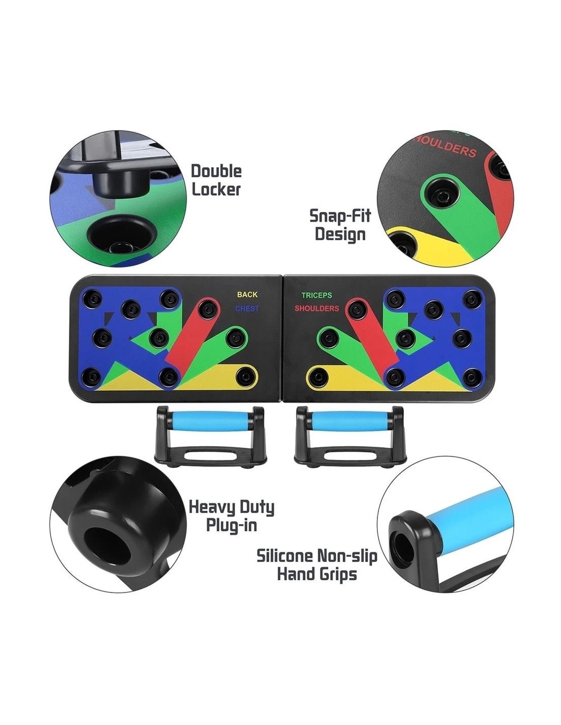 - Πολυλειτουργικό: Διαφορετική χρωματική κωδικοποίηση push up board στοχεύει σε συγκεκριμένους μυς που έχουν εργαστεί (Μπλε-στήθος, κόκκινο-ώμους, Κίτρινο-πλάτη και Πράσινο-τρικέφαλος)