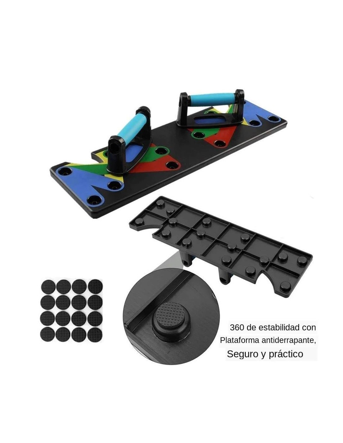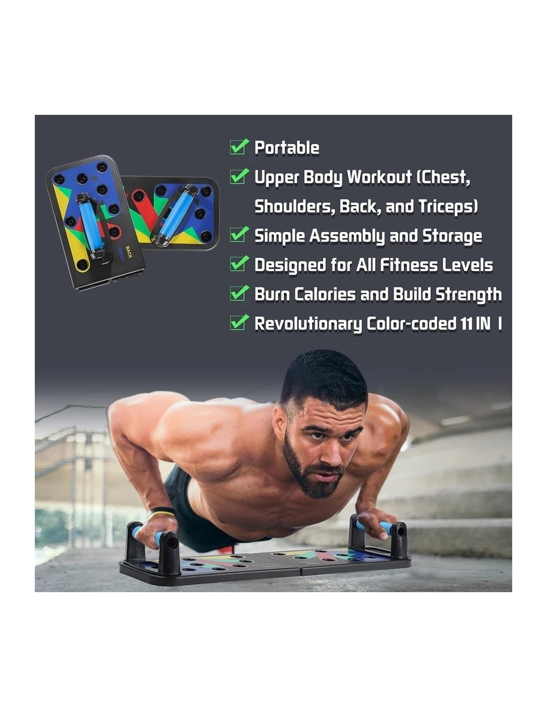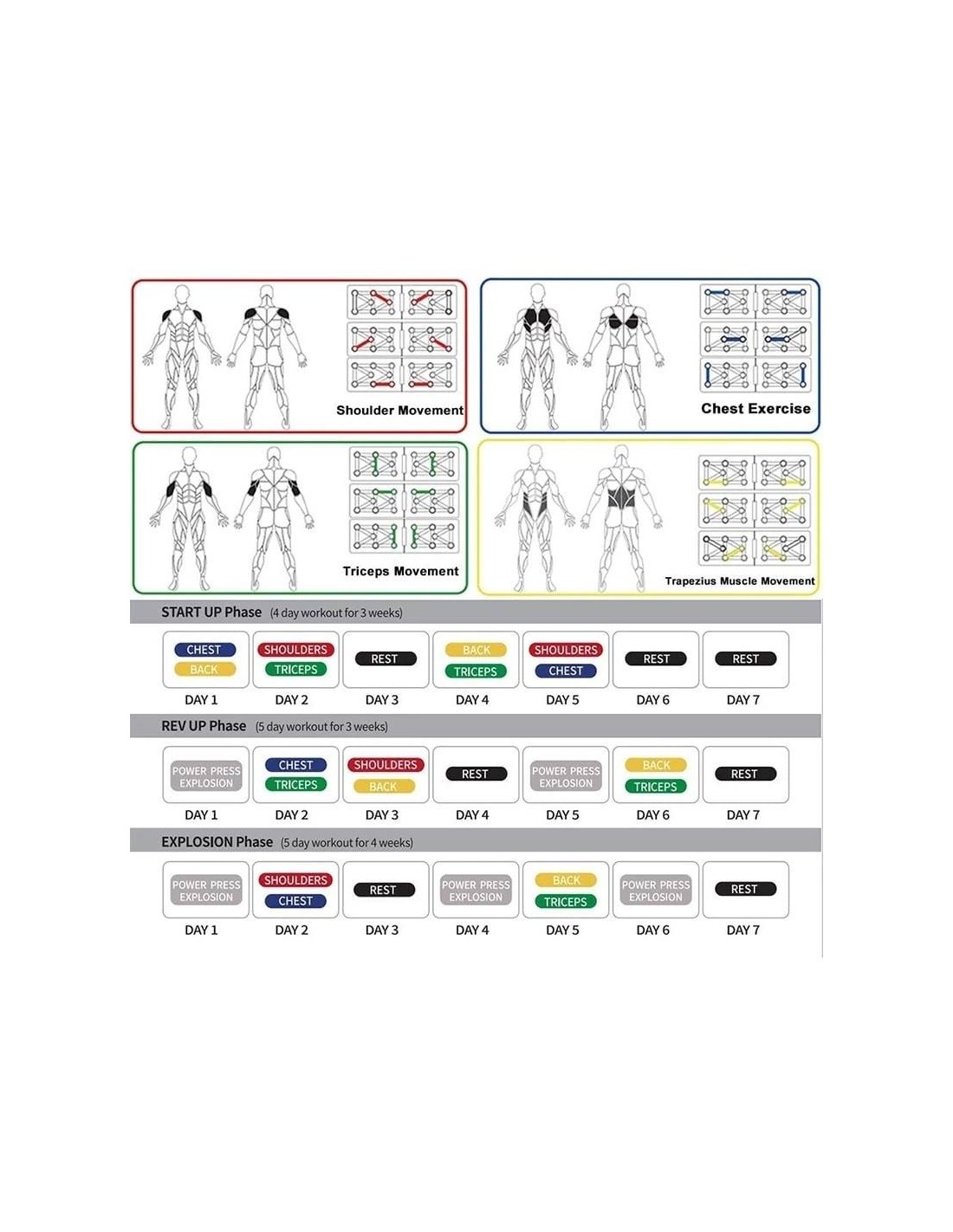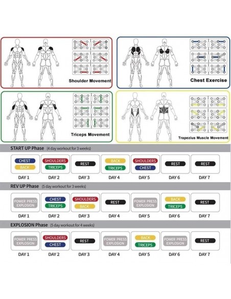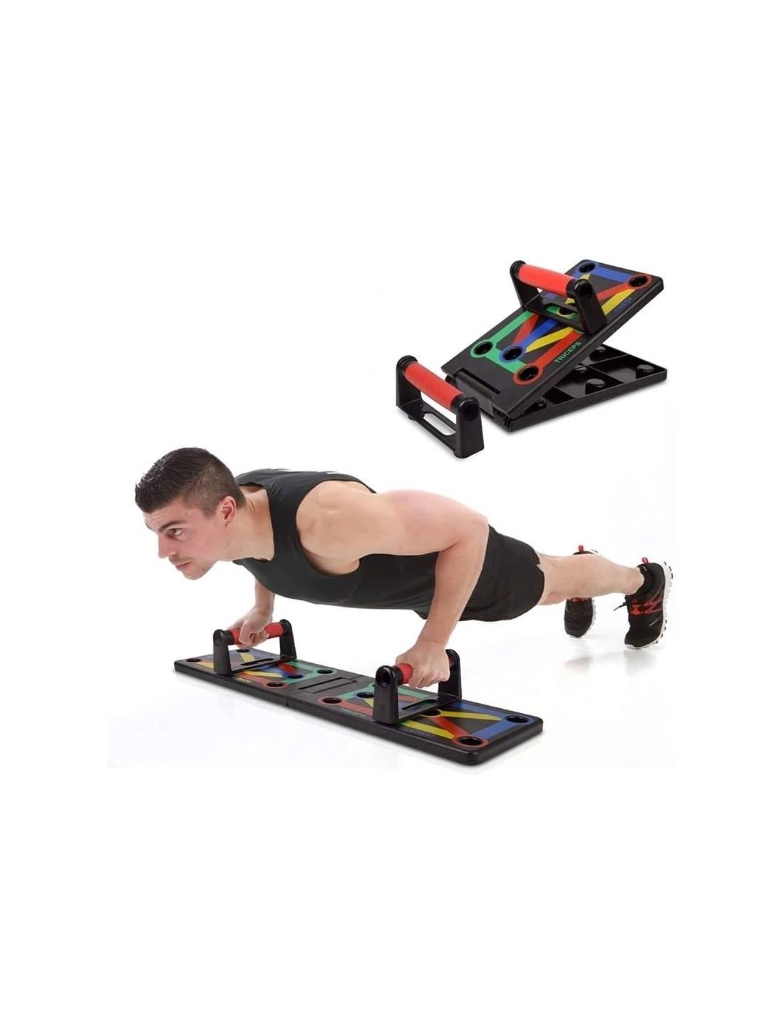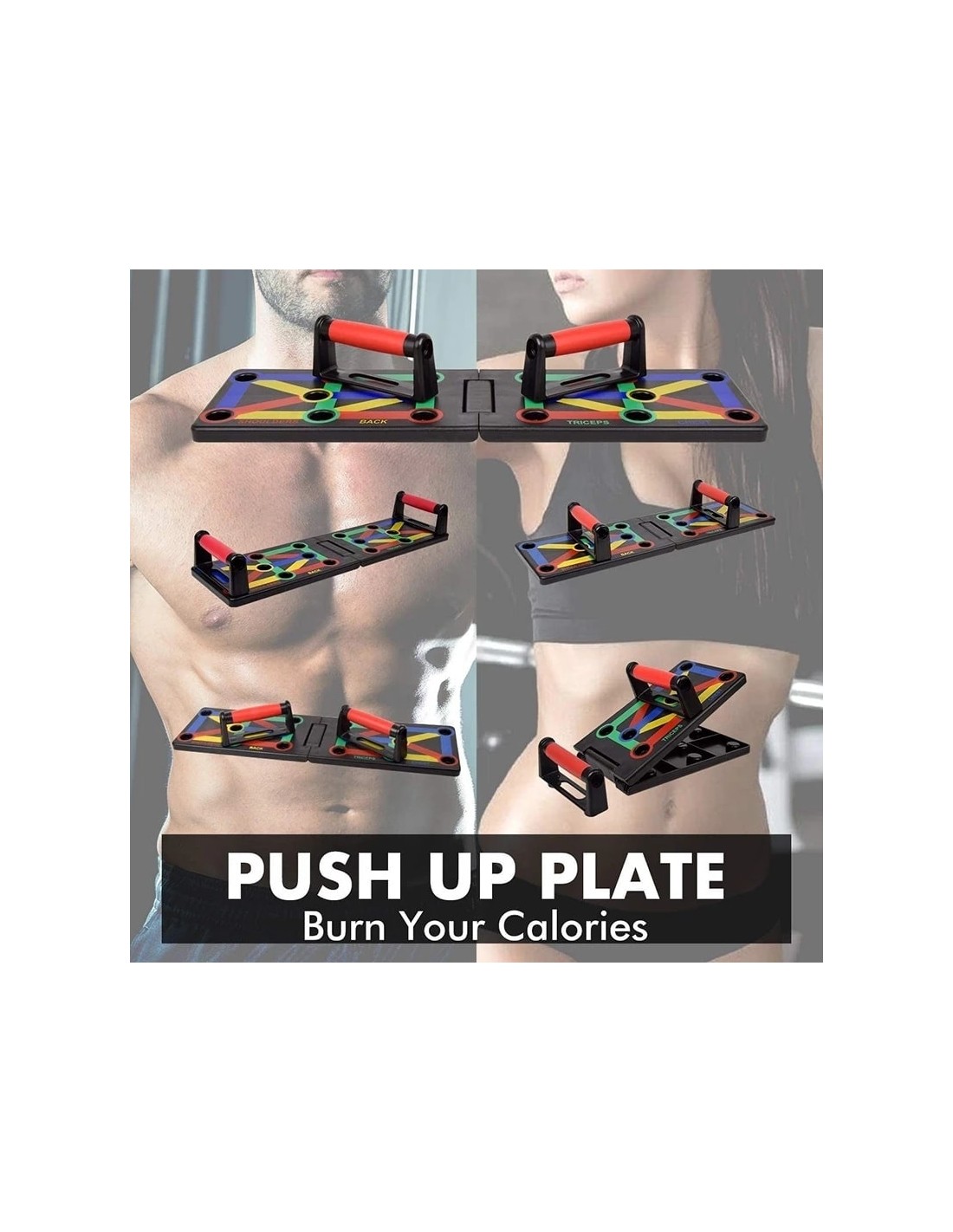 - Πολυλειτουργικό: Διαφορετική χρωματική κωδικοποίηση push up board στοχεύει σε συγκεκριμένους μυς που έχουν εργαστεί (Μπλε-στήθος, κόκκινο-ώμους, Κίτρινο-πλάτη και Πράσινο-τρικέφαλος)