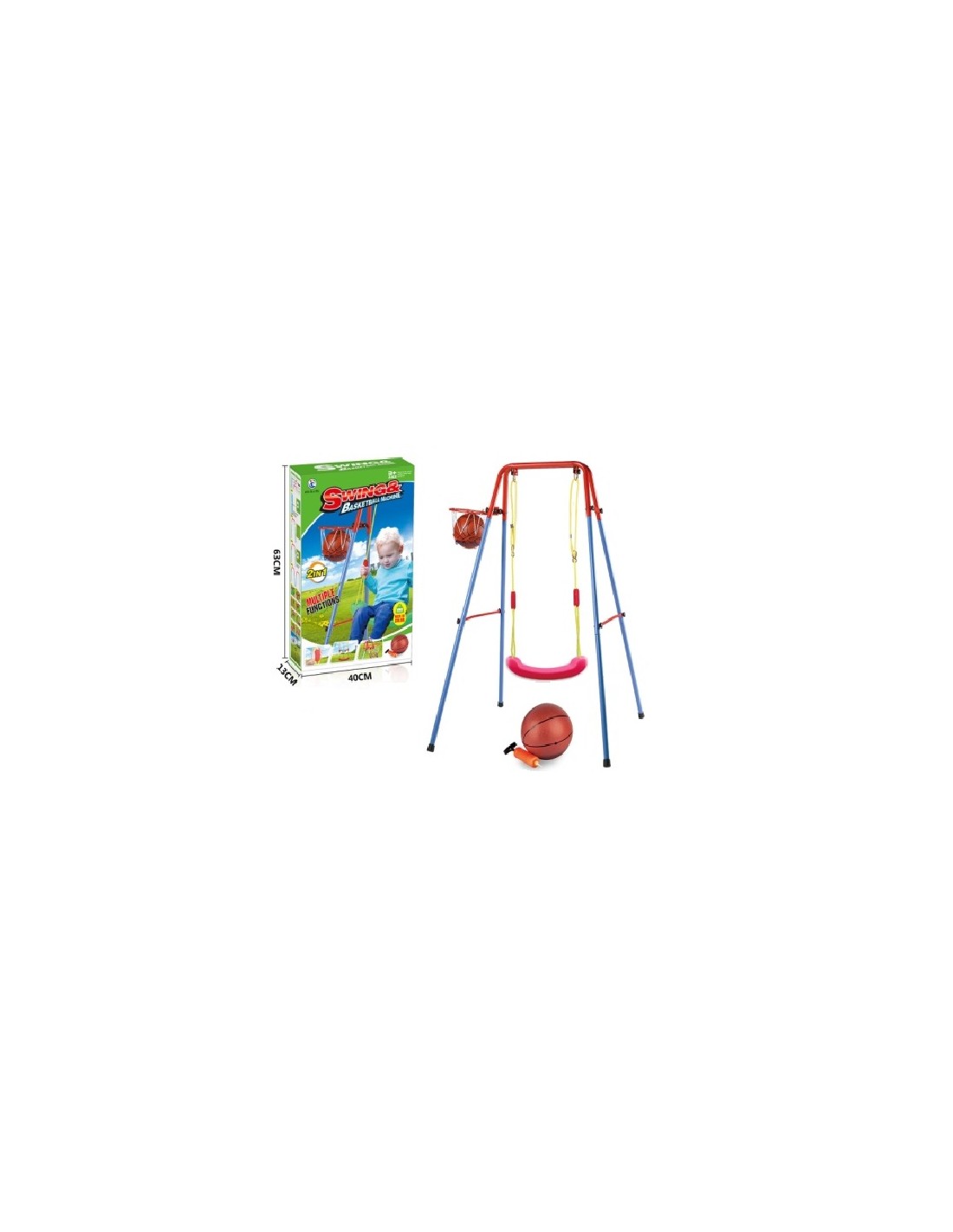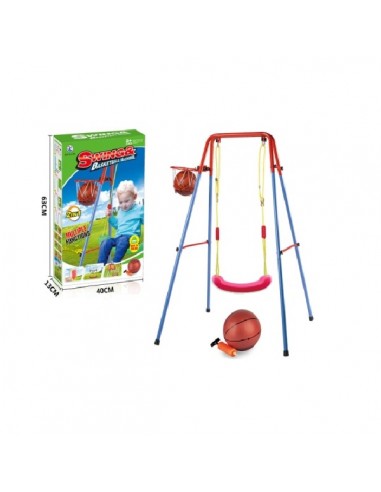 Παιδική πολύχρωμη κούνια με καλαθάκι μπάσκετ στο πλάι. Στιβαρή βάση στήριξης, απόλυτα ασφαλής, με πολύ εύκολη συναρμολόγηση και εγκατάσταση. Κατάλληλη για εσωτερικούς και εξωτερικούς χώρους. Περιλαμβάνεται μπάλα μπάσκετ και τρόμπα φουσκώματος.