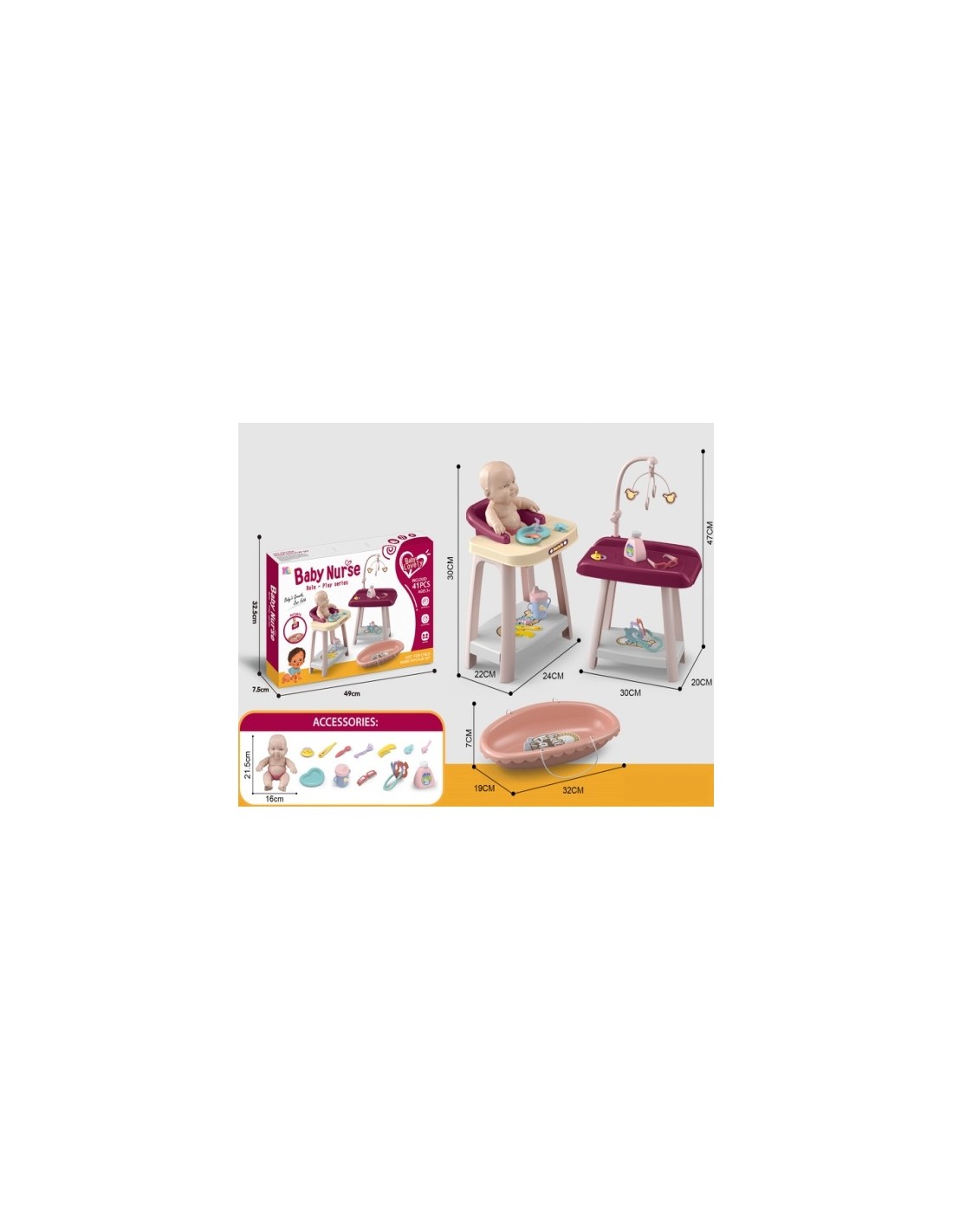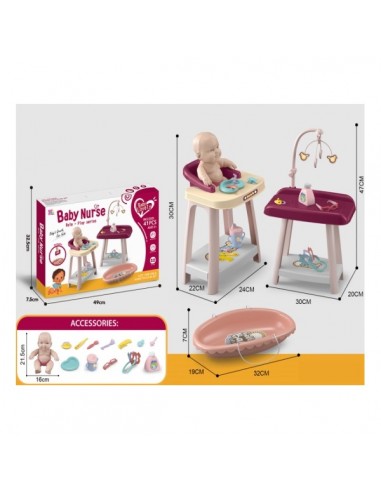 Πλήρες σετ φροντίδας μωρού με κούκλα, καρεκλάκι φαγητού, αλαξιέρα και καλάθι-κρεβατάκι. Περιλαμβάνει όλα τα απαραίτητα αξεσουάρ για την ολοκληρωμένη φροντίδα και την περιποίηση του μωρού σου!