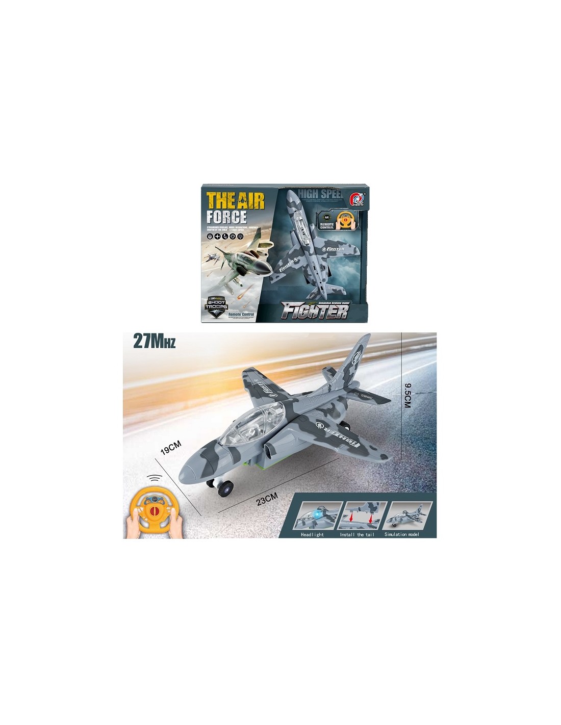Τηλεκατευθυνόμενο πολεμικό αεροπλάνο με τηλεχειριστήριο σε σχήμα τιμονιού και φωτισμό.