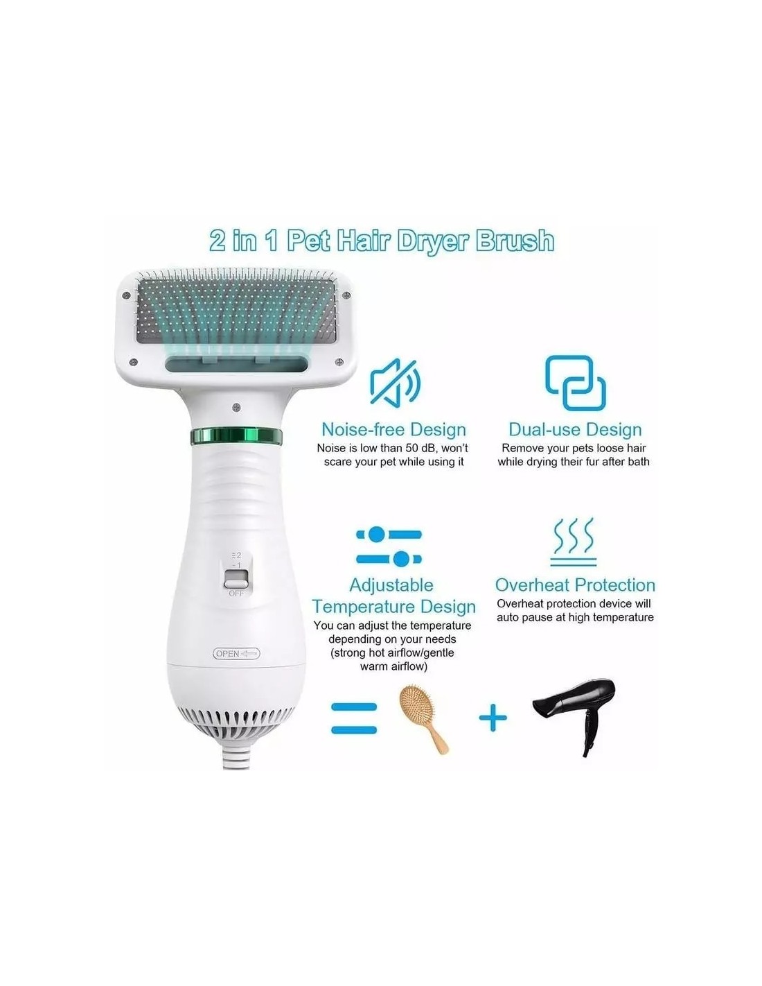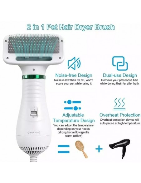 Χτενίστε και περιποιηθείτε το κατοικίδιο σας ενώ παράλληλα το στεγνώνετε, χωρίς τον ενοχλητικό θόρυβο του σεσουάρ που όλα τα κατοικίδια φορβούνται. Η λειτουργία στεγνώματος είναι εξαιρετικά αθόρυβη (<60 AB), ενώ η βούρτσα προσφέρει στο κατοικίδιο σας μια ευχάριστη αίσθηση μασάζ ενώ αφαιρεί το περιττό τρίχωμα. Με εργονομική σχεδίαση, απόλυτα φιλική προς το δέρμα του ζώου.