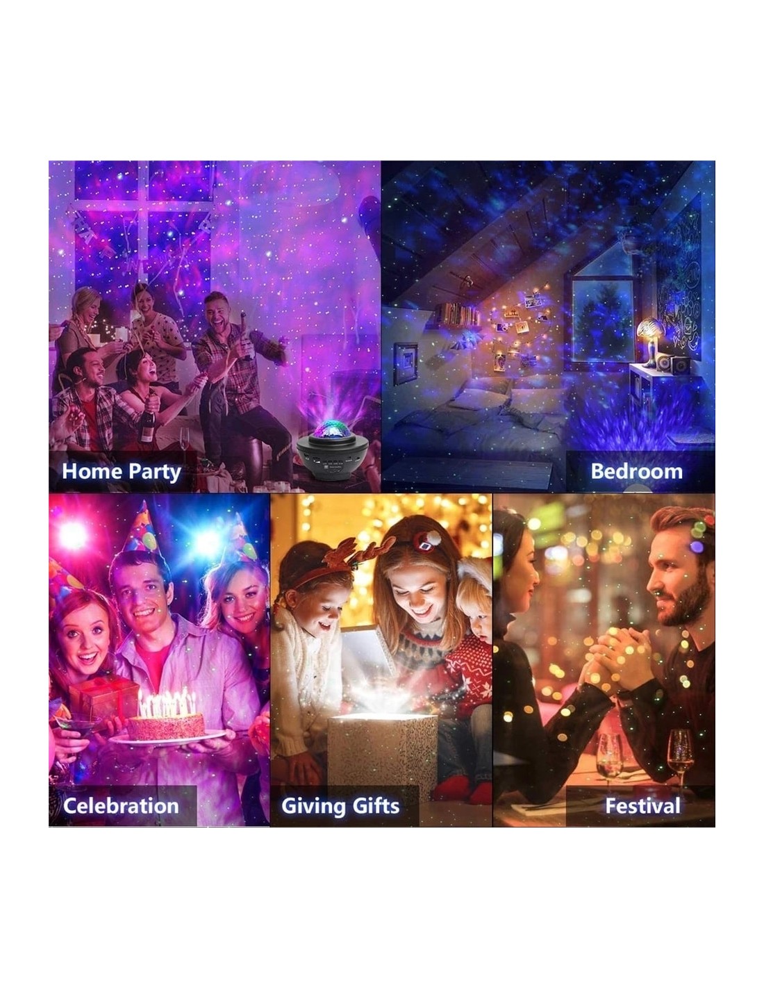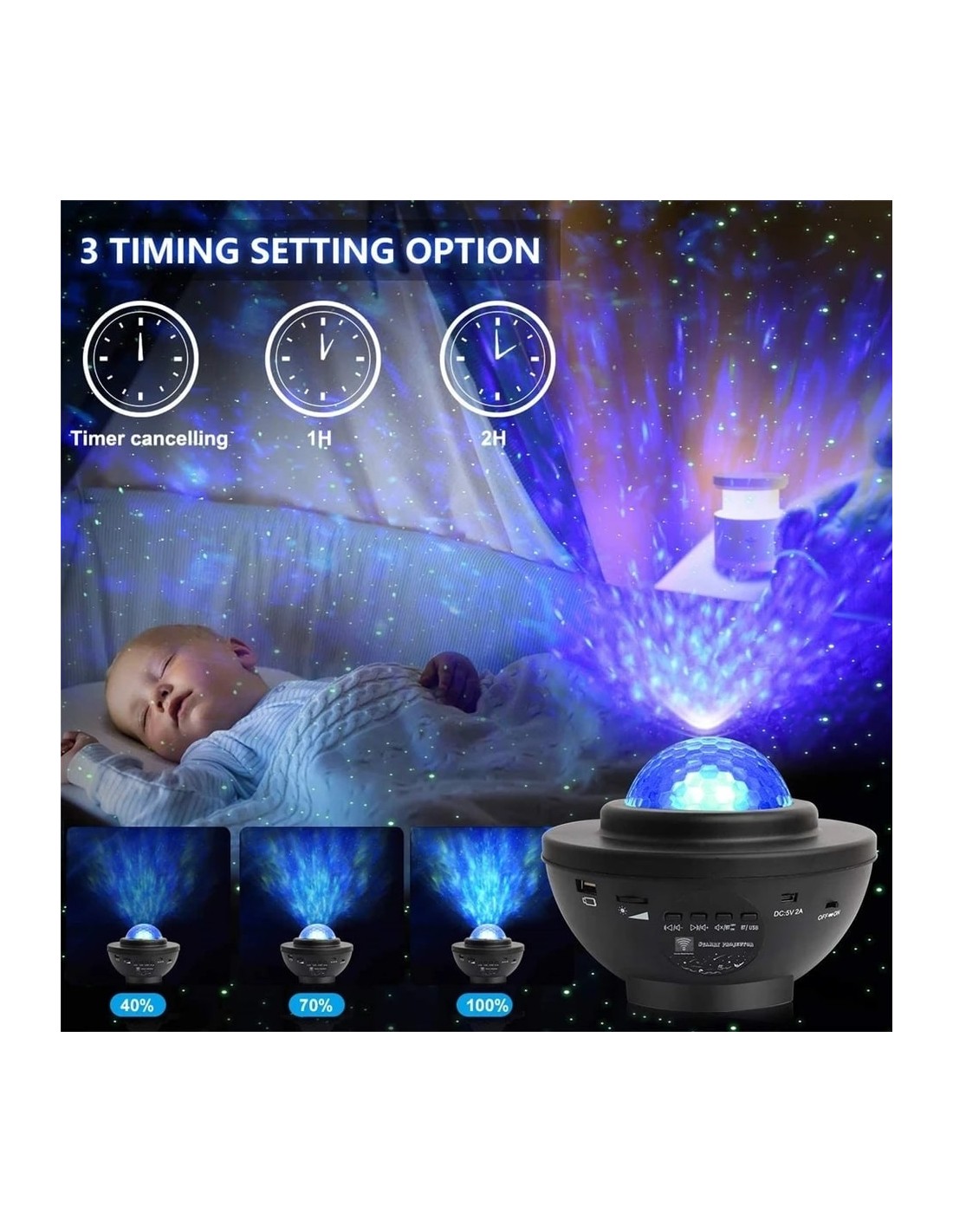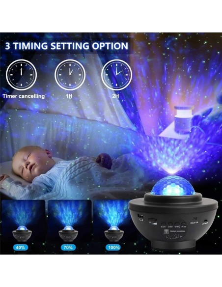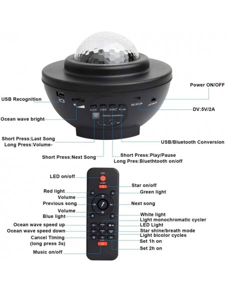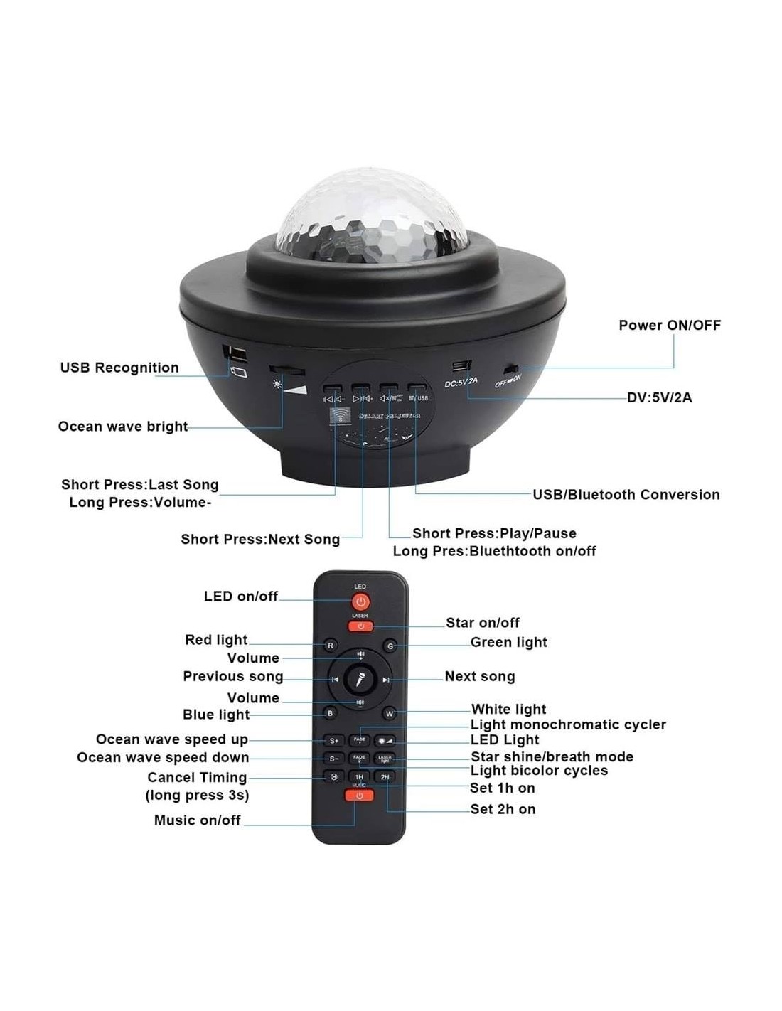 Δεκάδες συνδυασμοί χρωμάτων και ποικιλία λειτουργιών. Σε κάνει να νιώθεις σαν να ξαπλώνεις στον ωκεανό, κάτω από τα αστέρια, αναπτύσσοντας την παιδική φαντασία. Το τηλεχειριστήριο μπορεί να ελέγξει την αναπαραγωγή μουσικής, τα χρώματα φόντου LED, Starry / Galaxy. Ρυθμίστε τη φωτεινότητα, την ταχύτητα αλλαγής, ενεργοποιήστε / απενεργοποιήστε ελεύθερα τη λάμπα ή τη μουσική. Η λειτουργία ενεργοποίησης ήχου επιτρέπει την προβολή ή την αλλαγή της προβολής ανάλογα με το ρυθμό της μουσικής.
