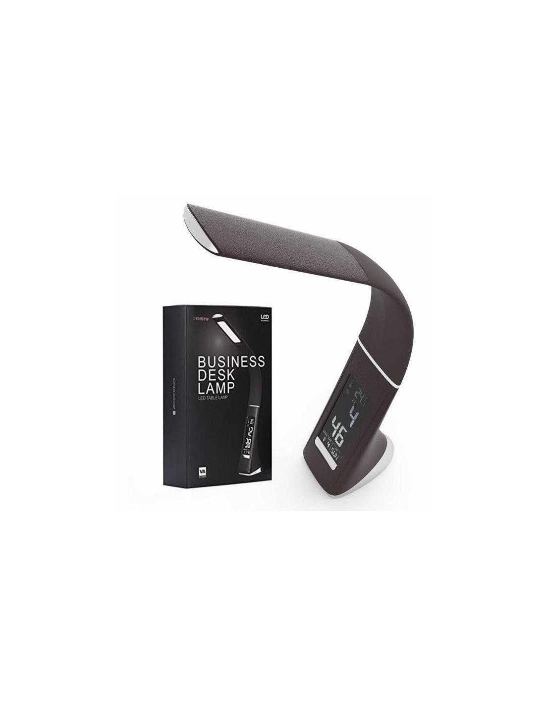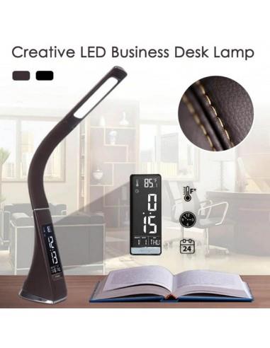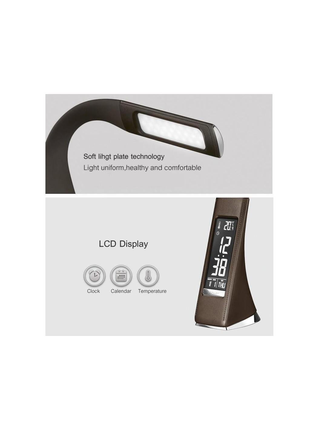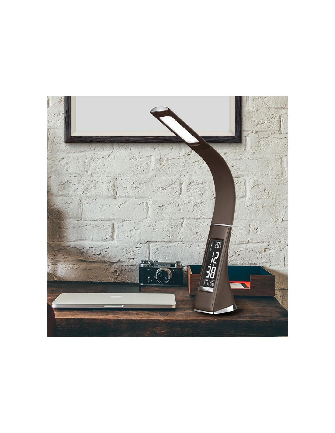 Υψηλής ποιότητας λάμπα γραφείου LED με μοντέρνο σχεδιασμό, ρολόι και θερμόμετρο. Έχει τη δυνατότητα να ρυθμίσετε την ένταση του φωτισμού. Η λάμπα δεν έχει σχεδιαστεί για φωτισμό ανάδειξης.
